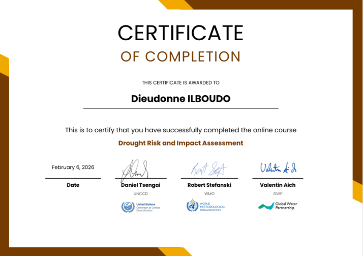 I am pleased to share that I have received my certificate from the online course "Drought Risk and Impact Assessment," delivered by UNCCD, WMO, and the Global Water Partnership (GWP). This training has strengthened my skills in drought risk and impact assessment, quantitative and qualitative analysis, understanding cascading and compound risks, and impact-based early warning systems. I strongly encourage professionals in the water, agriculture, climate, and development sectors to take this training to better anticipate and mitigate the impacts of drought. Together, let's build resilience to drought.