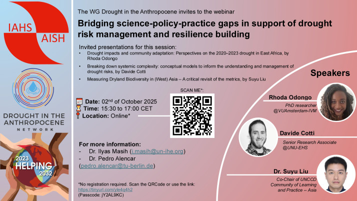 You are warmly invited to this webinar organized by IAHS - International Association of Hydrological Sciences working group on Drought in the Anthropocene Network (DitA).📢 This is the third DiTA webinar of 2025 focusing on the theme “Bridging Science-Policy-Practice Gaps in Support of Drought Risk Management and Resilience Building”. The discussion will be inspired by three invited presentations: