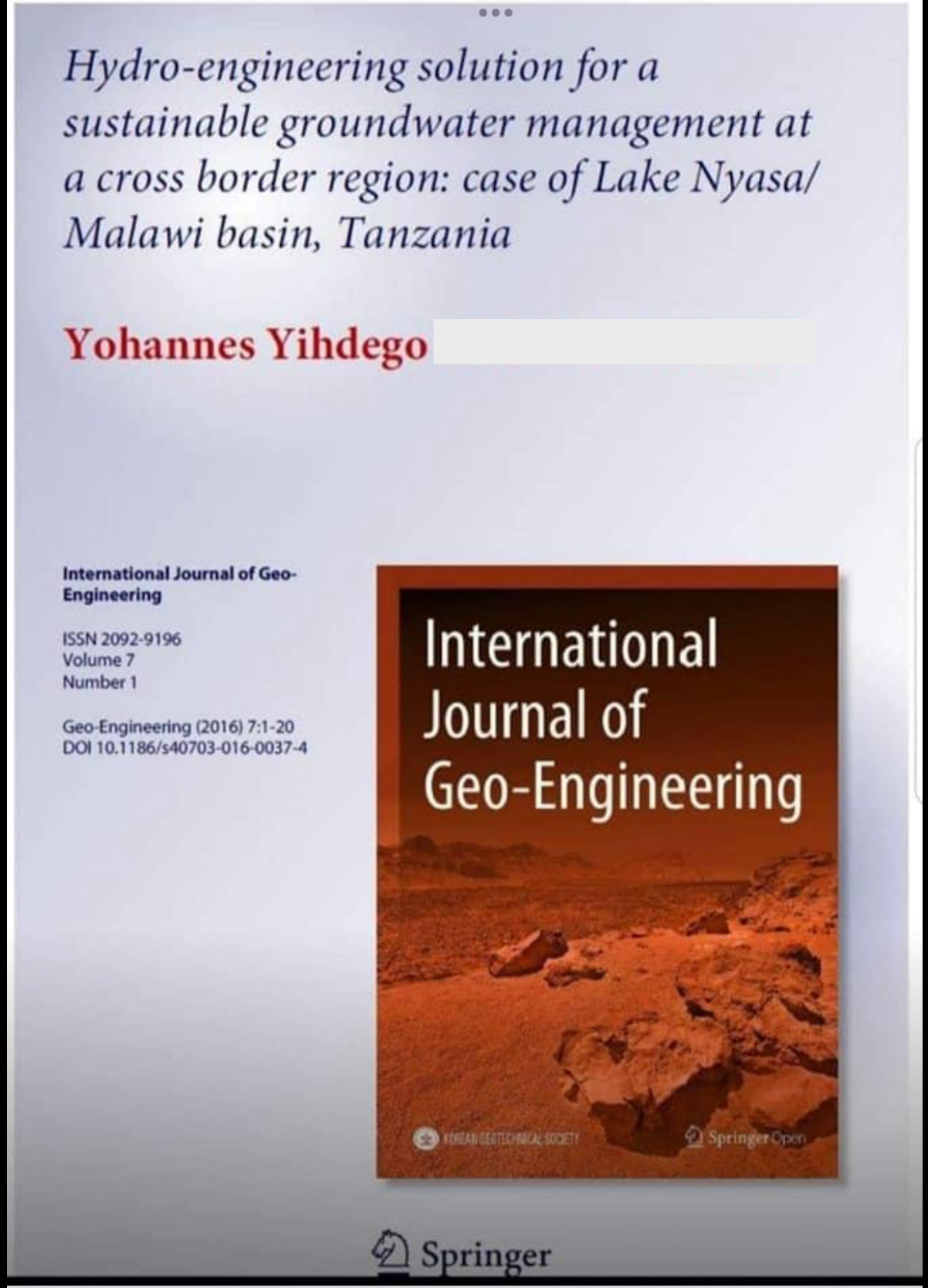 To introduce myself, my name is Yohannes (Dr), a Senior Principal Hydrogeologist, Australia. I bring years of research & consulting experience in hydrogeology/ geotech modelling, engineering geology, environmental geoscience, and water resource management, drought and climate detailed projects & publications in my profile links below my signature.